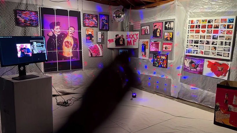 A celebration of the life of a dear friend, Kim Brown, who died unexpectedly while I was making Heartbroken: 7 Spells. Kim was a video photographer, performer and collaborator. The mixed media installation and performance includes video, screenshot images, collage, and objects. Disco ball, cardboard structures, disco lights. Images were sourced and remixed into a multi-layered and dimensional work. Primary video media from the 2001 "Princes" video and 2024 "Shooting with Kim" video.